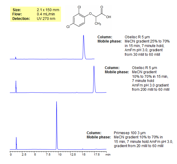 Dichlorprop (2,4-DP) is an herbicide similar to 2,4-D. Dichlorprop is used to control weeds and can be found in many weed killers. Only the R-isomer of 2,4-dichloropropanoic acid is used as an herbicide. The EURL (European Union Reference Laboratory) included dichlorprop in a list of acidic pesticides which can be analyzed by a QuEChERS (Quick, Easy, Cheap, Effective, Rugged, and Safe) single residue method. 2,4-DP was separated by both Obelisc R and Primesep 100. Primesep 100 is a reverse-phase column with embedded acidic ion-pairing groups while Obelisc R is a mixed-mode column with separates using ionic groups and a long hydrophobic chain. Methods are LC/MS compatible and able to be used with many pesticides.
