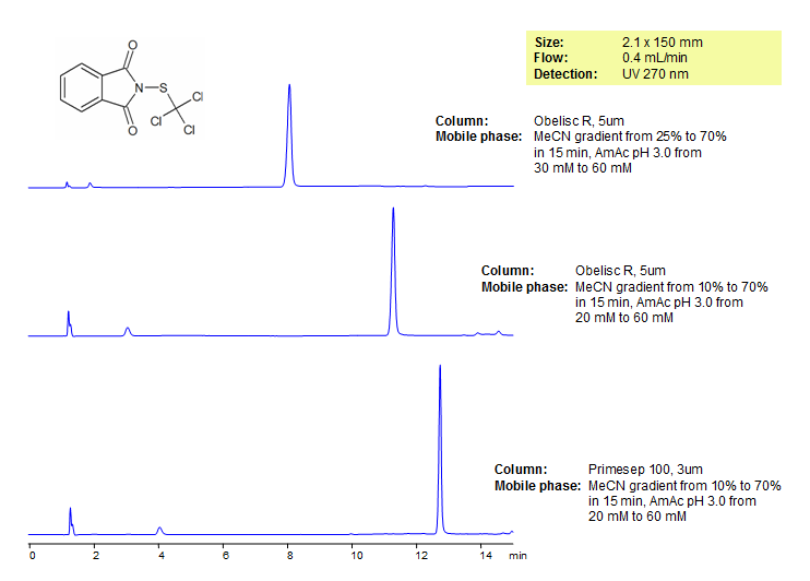 Folpet is a fungicide which is used to prevent a variety of fungal infections such as apple scab, cherry leaf spot, rose black spot, and rose mildew. Folpet was one of many pesticides studied by the EURL-SRM, a proficiency test for single residue methods developed by the European Union Reference Laboratory. Folpet was retained and separated from impurities with Obelisc R and Primesep 100 columns. Primesep 100 contains embedded acidic ion-pairing groups and Obelisc R contains embedded ionic and hydrophobic groups which can assist in fine tuning separations. Method can be used for dozens of other pesticides and is LC/MS compatible.
