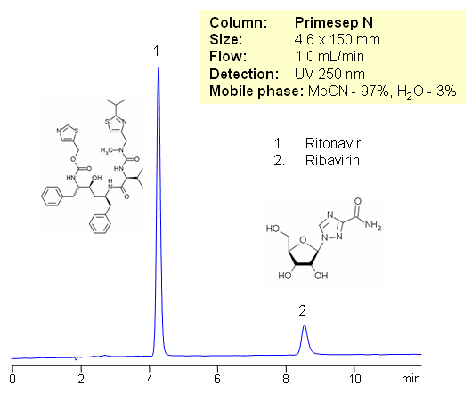 Ritonavir and Ribavarin are two drugs which are very different in their properties for HPLC separation. Very hydrophobic and very hydrophilic drugs are separated on Primesep N using Hydrophilic Interaction Chromatography (HILIC). Ritonavir is an antiretroviral drug from the protease inhibitor class used to treat HIV infection and AIDS. Ritonavir is very hydrophobic and non-ionizable and retains very long in reverse phase chromatography. Ribavirin is an anti-viral drug which is active against a number of DNA and RNA viruses. It is a member of the nucleoside antimetabolite drug, which makes it very hydrophilic.
