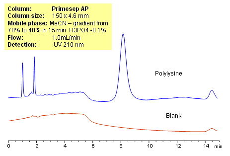 Polylysine is a small natural homo-polymer made out of amino acid lysine that is produced by bacterial fermentation. Due to the fact that it is a complex mixture of polymers with different molecular weight it is very hard to obtain a single sharp peak for this compound. Polylysine was successfully analyzed on a Primesep AP column in HILIC/cation-exclusion mode. Cation-exclusion mode on a Primesep AP column allows to obtain sharper peak. Presence of the basic groups on the surface of silica eliminated silanol interactions between basic sites of polylysine and acidic sites of Primesep AP column.
