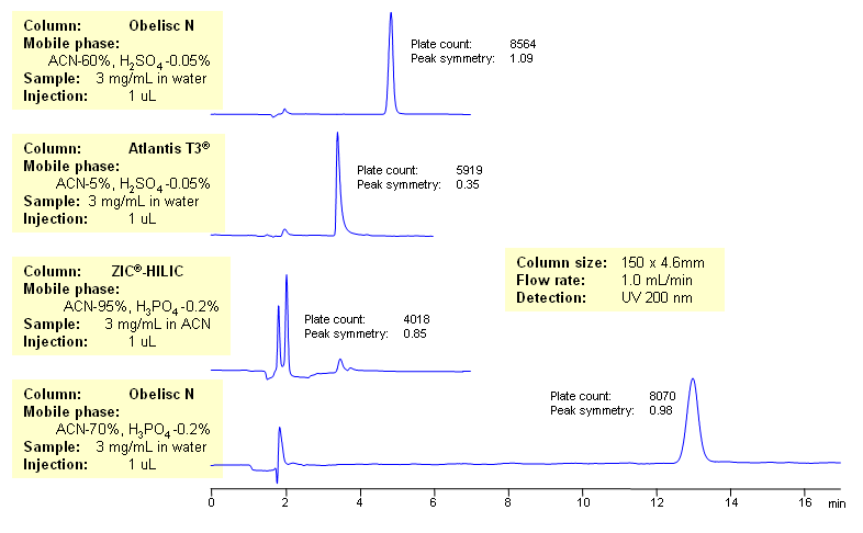 Dual functionality of Obelisc N column allows to retain and provide efficient peaks of strong carboxylic acids such as TFA. Simple UV quantitation and identification method became possible due to the unique properties of this stationary phase. In case of an RP separation poor retention and peak symmetry was obtained at a very low concentration of ACN. Sulfuric acid was used to suppress ionization of TFA to increase the hydrophobicity. In case of a typical HILIC column the phosphoric acid was used to increase ionization to make TFA more polar to enhance polar retention. The types of columns that do not have the mixed mode nature of Obelisc N can’t provide significant retention and efficiency.