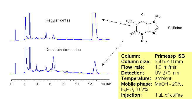 The amount of caffeine in regular and decaffeinated coffee can be determined using a Primesep SB column. The HPLC method combines reversed-phase and polar interactions to elute caffeine without interference from the coffee complex mixture. This method can be made even more robust by incorporating a diverter valve and a guard column to prevent late eluting components from sticking to the Primesep SB column. The sample is injected onto the guard column and after a defined time point, the eluent flow is reversed to elute the caffeine peak onto the analytical column without the late eluters that can shorten column life. The HPLC separation uses a mobile phase of water, methanol (MeOH) and phosphoric acid (H3PO4) and UV detection at 270 nm.