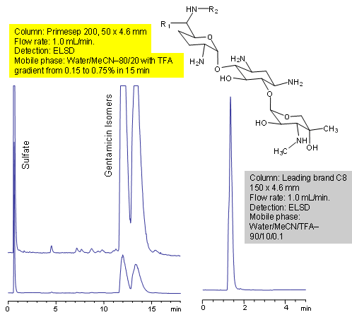 Primesep 200 separates the very hydrophilic gentamicin isomers. Gentamicin contains multiple primary and secondary amines as well as multiple hydroxyl groups. Ion-exchange and other polar interactions provide retention for a compound that elutes in the void of a traditional C8 column. The separation uses a simple mobile phase of water, acetonitrile (MeCN, ACN), and trifluoracetic acid (TFA) with evaporative light scattering detection (ELSD).