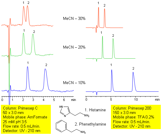Histamine is a basic compound that acts like neurotransmitter. Phenethylamine is a natural amine alkaloid psychoactive compound with stimulant effects. It forms by enzymatic decarboxylation of phenylalanine, and also acts as neurotransmitter. Both compounds are separated in one HPLC run on Primesep C and Primesep 200 columns by reversed-phase cation-exchange mechanism. Primesep C provides shorter retention time and histamine and phenethylamine can be separated within 5 minutes. Primesep C and Primesep 200 columns do not require ion-pairing reagent as it is attached to the surface of Primesep silica gel. Method can be used for analysis of these two compounds in plasma, blood and urine with UV, ELSD, CAD or LC/MS detection.
