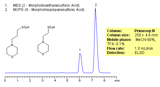 MOPS and MES are buffers used in biology and biochemistry. They consist of a morpholine ring and propanesulfonic acid. Both molecules are zwitter-ionic and very polar. No retention can be achieved on reversed-phase columns. MOPS and MES are analyzed in HILIC mode on a Primesep N HPLC column. Other biological buffers can be analyzed with this general method. Biological buffers are not UV active and can be monitored by ELSD, CAD or LC/MS.