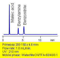 Primesep 200 separates acids, bases, and neutrals in one injection. Maleic acid, benzonitrile, and benzylamine are baseline resolved by a combination of reversed-phase, ion-exchange, and ion-exclusion mechanisms. Excellent peak shape results with a mass spec compatible mobile phase of water, acetonitrile (MeCN, ACN) and trifluoracetic acid (TFA) with UV detection at 210 nm.