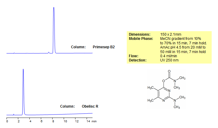 Pirimicarb is a carbamate pesticide used mostly to control aphids on non-food crops. The EURL included pirimicarb as a target pesticide for the EUPT-CF9. Obelisc R was used to retain pirimicarb and separate it from impurities. Primesep B2 and Obelisc R were used to retain pirimicarb and separate it from impurities. Primesep B2 contains embedded basic ion-pairing groups and Obelisc R contains embedded ionic and hydrophobic groups which can assist in fine tuning separations. Method is LC/MS compatible and can be used as a general approach for analyzing pirimicarb and dozens of other pesticides.