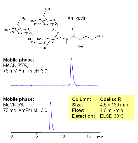 Amikacin is an aminoglycoside antibiotic used to treat different types of bacterial infections. Most of aminoglycoside antibiotic are very polar compounds containing several amino groups and sugar fragments. Such compounds are not retained on reverse phase column without ion-pairing reagents. In this application Amikacin is retained on Obelisc R column without ion-pairing reagent. Retention is contributed to mixed-mode mechanism and can be adjusted by buffer pH and buffer concentration. Amount of organic modifier (acetonitrile, tetrahydrophuran, etc.) can be used for fine tuning and improvement of peak shape. Other amino sugars can be analyzed using mixed-mode stationary phases with ELSD, LC/MS and prep chromatography compatible mobile phases.