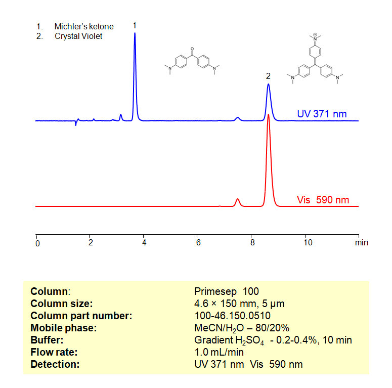 Michler’s ketone and Crystal Violet can be separated, retained, and analyzed on a Primesep 100 mixed-mode stationary phase column using an isocratic analytical method with a simple mobile phase of water, Acetonitrile (MeCN), and a sulfuric acid (H2SO4) buffer. This analysis method can be detected in the UV-Vis regime at 540, 590, and 200 nm.
