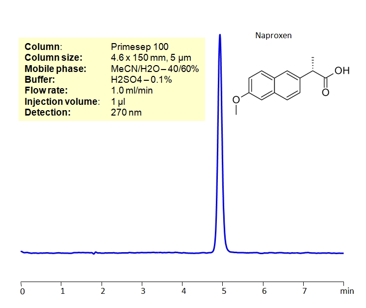 Naproxen , Naproxen Sodium can be retained and analyzed using the Primesep 100 stationary phase column. The analysis utilizes an isocratic method with a simple mobile phase consisting of water and acetonitrile (MeCN) with a sulfuric acid buffer. Detection is performed using UV.