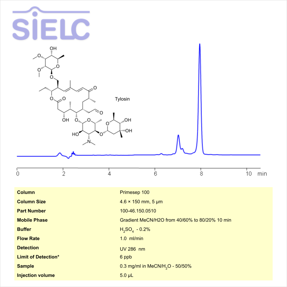 Tylosin can be retained and analyzed using the Primesep 100 stationary phase column. The analysis utilizes a gradient method with a simple mobile phase consisting of water and acetonitrile (MeCN) with a sulfuric acid buffer. Detection is performed using ELSD.