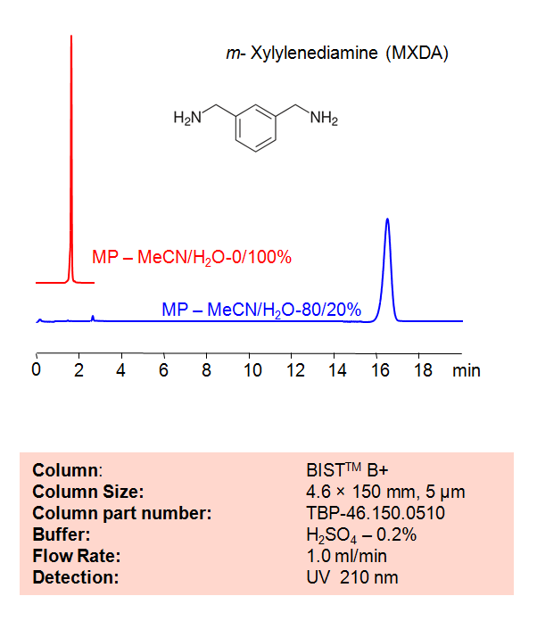HPLC Method for Analysis of m-Xylylenediamine on a BIST™ B Column. m-Xylylenediamine (MXDA) is a popular curing agent used on epoxy resins. Using SIELC’s newly introduced BIST™ method, MXDA, which protonates in water, can be retained on a positively-charged anion-exchange BIST™ B column. There are two keys to this retention method: 1) a multi-charged, negative buffer, such as Sulfuric acid (H2SO4), which acts as a bridge, linking the positively-charged MXDA analytes to the positively-charged column surface and 2) a mobile phase consisting mostly of organic solvent (such as MeCN) to minimize the formation of a solvation layer around the charged analytes. Using this new and unique analysis method, MXDA can be retained and UV detected at 210 nm.