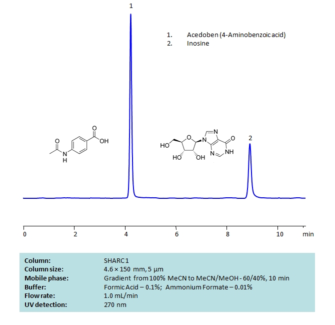 Inosine pranobex is an antiviral drug. A combination of inosine and dimepranol acedoben (a salt of acetamidobenzoic acid and dimethylaminoisopropanol) has no effect on viral particles itself. Instead, it acts as an immunostimulant. It is most commonly used to treat the rare measles complication subacute sclerosing panencephalitis in conjunction with intrathecal interferon therapy. Chromatography of these two compounds can be difficult due to their high polarity. But both compounds can be well retained and separated using anhydrous (water-free) conditions using HPLC on SHARC 1 column, which uses hydrogen-bonding as a separation mechanism. The method uses a gradient of acetonitrile (ACN) and methanol (MeOH) mobile phase with volatile buffer containing Formic Acid 0.1% and AmFm – 0.01%, making the method MS-compatible. Both compounds can also be UV detected at 270 nm.