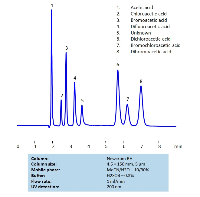 Acetic acid and its various chloro- and bromo- forms are widely used in organic chemistry. Their similar structure makes the acids difficult to retain and separate on reverse-phase HPLC columns. By using Newcrom BH mixed-mode column which also has ion-exchange properties, the separation can be achieved with a simple isocratic method and relatively short time with a mobile phase of acetonitrile (ACN), water and sulfuric acid (H2SO4) buffer. UV detection at 200nm.