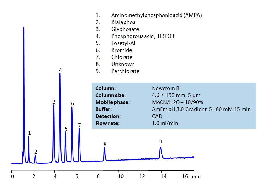 High Performance Liquid Chromatography (HPLC) Method for Analysis of Glyphosate , Phosphorous acid , Fosetyl-Al , Bromide , Chlorate , Perchlorate , Bialaphos , Aminomethylphosphonic acid (AMPA) , Bromate , Sodium Bromate , 3-(Methylphosphinico)propionic acid .