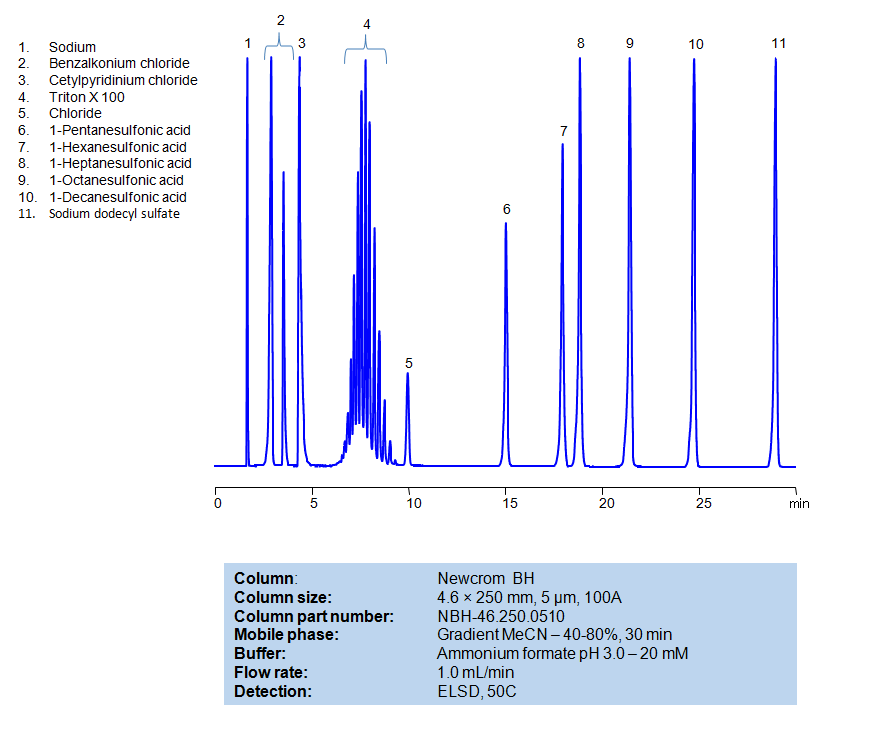 | Analyzing Compounds | Benzalkonium chloride,Cetylpyridinium Chloride,Triton X100,1-Pentanesulfonic acid,1-Hexanesulfonic acid, sodium salt,1-Heptanesulfonic acid,1-Decanesulfonic acid,Sodium dodecyl sulfate,1-Octanesulfonic acid |