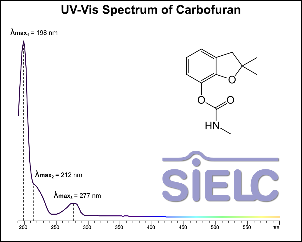 For optimal results in HPLC analysis, it is recommended to measure absorbance at a wavelength that matches the absorption maximum of the compound(s) being analyzed. The UV spectrum shown can assist in selecting an appropriate wavelength for your analysis. Please note that certain mobile phases and buffers may block wavelengths below 230 nm, rendering absorbance measurement at these wavelengths ineffective. If detection below 230 nm is required, it is recommended to use acetonitrile and water as low UV-transparent mobile phases, with phosphoric acid and its salts, sulfuric acid, and TFA as buffers. For some compounds, the UV-Vis Spectrum is affected by the pH of the mobile phase. The compound was dissolved using acetonitrile.
